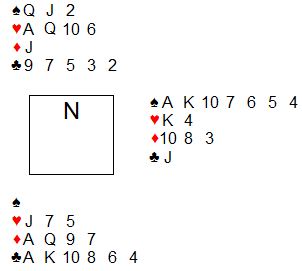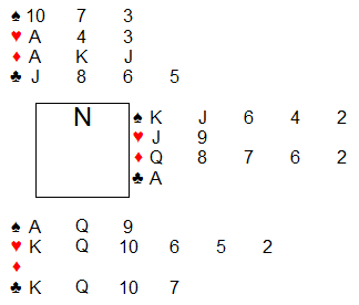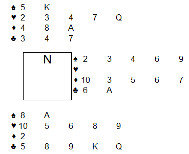 兴趣就是动力,要开学了,本期上概率论,老是讲赌博起源乏味了,从桥牌入手吧,大量的牌型分布概率计算就很好,昨晚用R写了一个自动发牌程序,就遇见下面这副牌,如何叫牌都是个问题,南北有4?定约,东西有点力优势,如果东西有局,干扰的情况下如何进局?西逼叫情况下南北几乎肯定会叫上局去阻击,对东西牌手是巨大的考验。